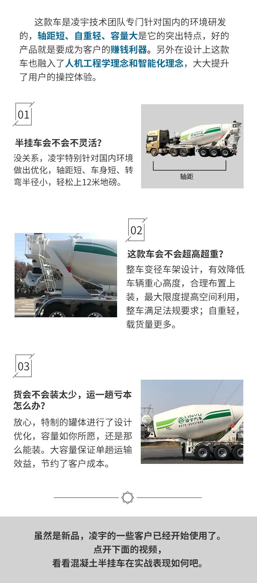 早在201 6年中集凌宇就將混凝土攪拌運輸車推向市場,是國內混凝土半掛車研究領域的領頭羊。國內因為市場環境的原因,使用的客戶并不多,當時主要是出口。當然,凌宇也沒有忘記國內市場。隨著國內少量客戶的采購,凌宇不斷的調研市場,緊盯國內環境的變化,逐步完善產品。